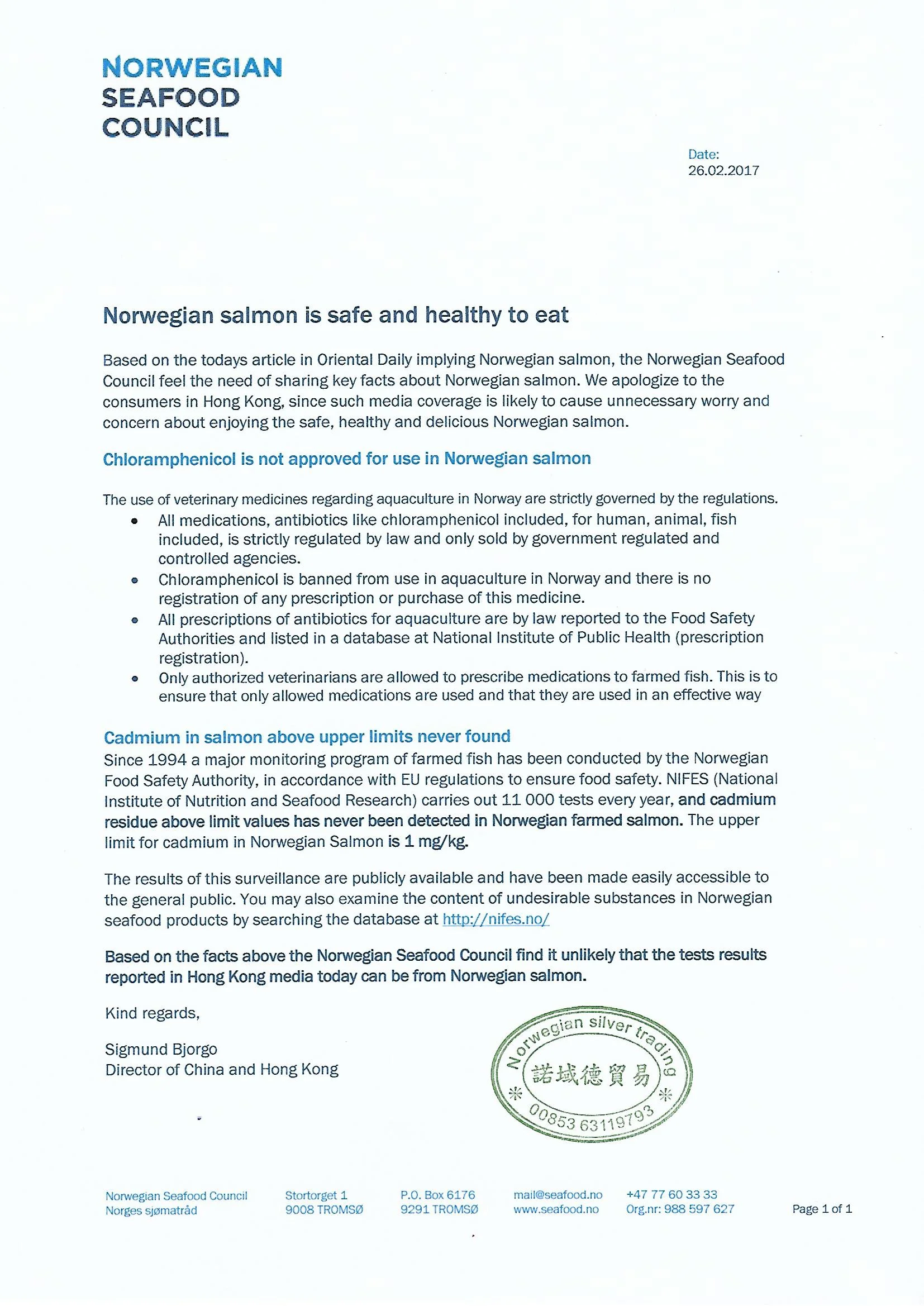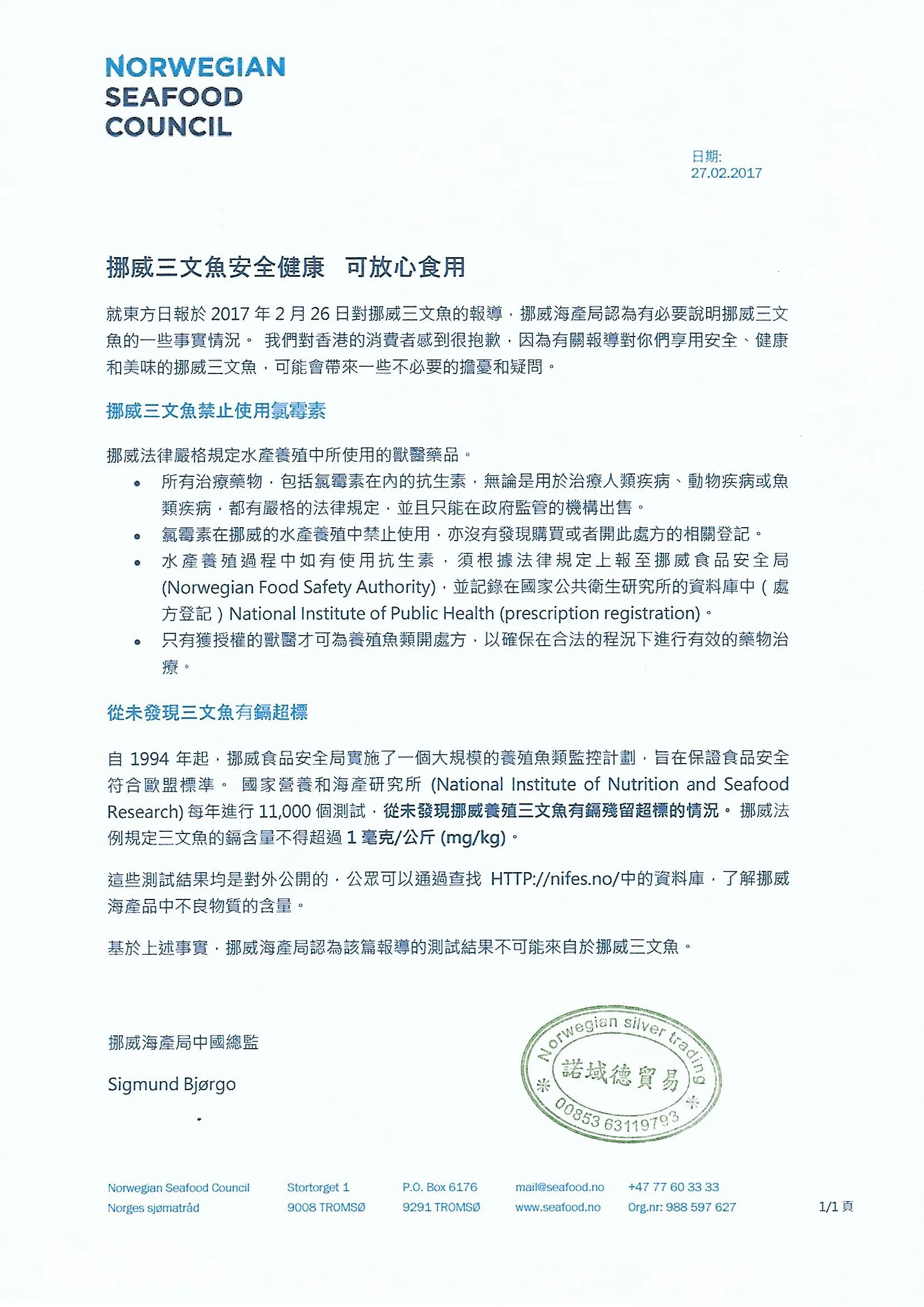 挪威魚場就對早排香港三文魚含激素和有毒物質而作出通告解釋